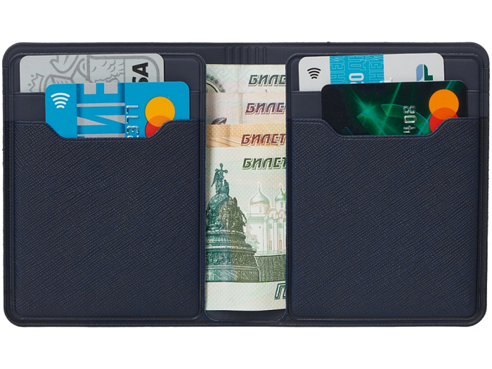 Картхолдер имеет складную конструкцию. Внутри расположены шесть отсеков для карт и отделение для купюр.
