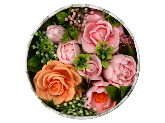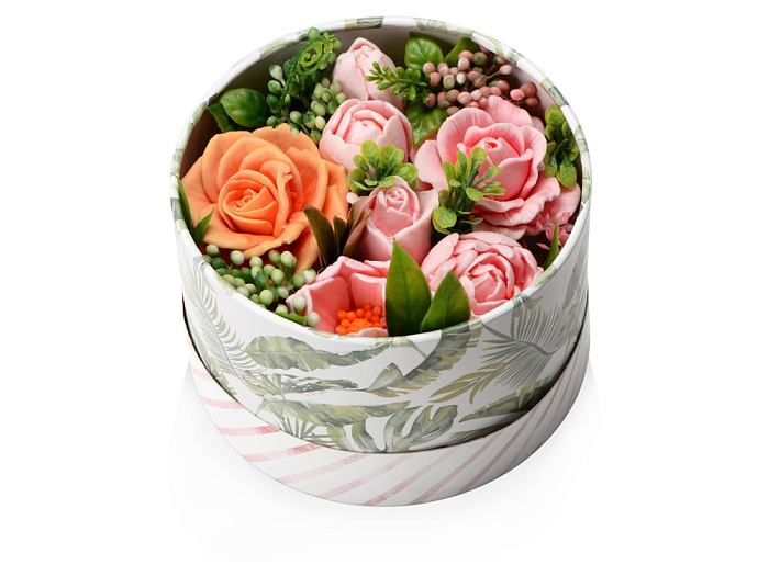 Впечатляющая и изысканная композиция из мыла ручной работы в подарочной коробке. В основе - яркие и реалистичные цветы с нежным ароматом. В композиции также использован флористический декор.