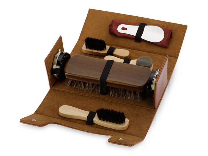 Настоящий сундучок из коричневого кожзама содержит целую кладезь полезных аксессуаров для чистки обуви. Набор не занимает много места при хранении и всегда готов прийти на помощь в поддержании чистоты вашей обуви. В набор входит 8 предметов. На футляр можно нанести логотип.