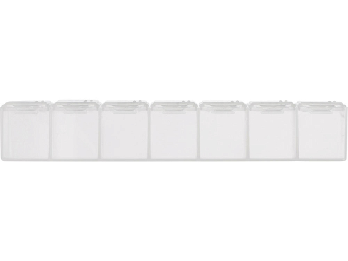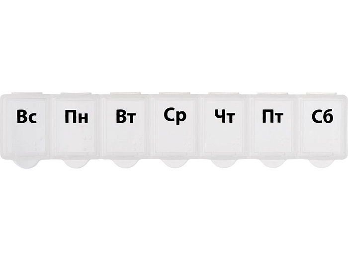 Таблетница с днями недели. Надписи продублированы шрифтом Брайля на английском языке.