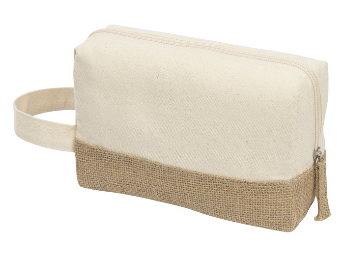 Вместительная косметичка классической формы, визуально разделенная на две части в оттенках небеленой ткани. Нижняя часть косметички выполнена из джута, верхняя – из хлопка. Материал подкладки – полиэстер. Минимальное использование синтетических тканей, экологичный продукт. За счет эргономичной формы, вместительности и ручки идеальна для путешествий.
