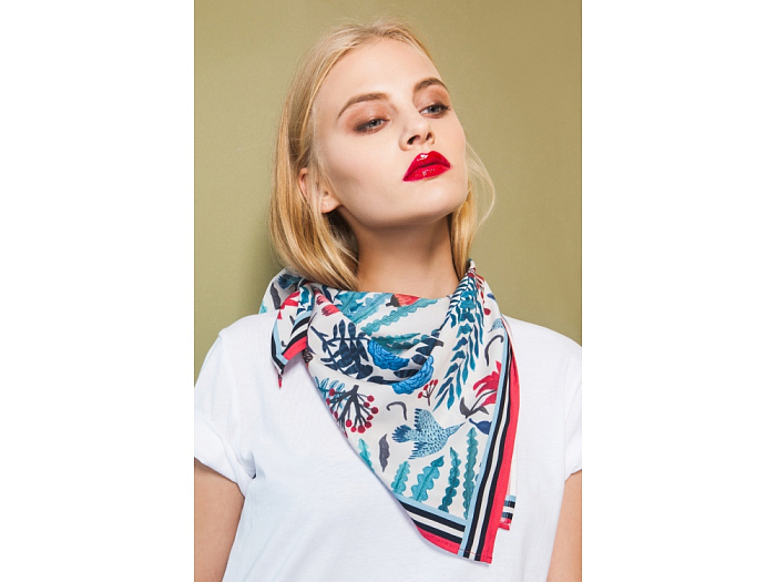 Платок из искусственного шелка саржевого плетения (твил) размером 70*70 см., с авторским принтом «Голубые розы».