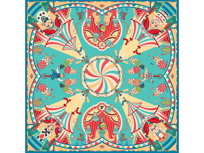 На полотне воплощена добрая атмосфера народного веселья и волшебства, где каждый рисунок напомнит о сказках, ярмарках и лубочных иллюстрациях. В центре лучится купол цирка, разноцветный словно леденец, а вокруг раскинулись нарядные шатры. В свете софитов запечатлены расписные образы игрушек, зверей, эквилибристов и силачей – уникальные и неповторимые, они образуют кружащийся танец.