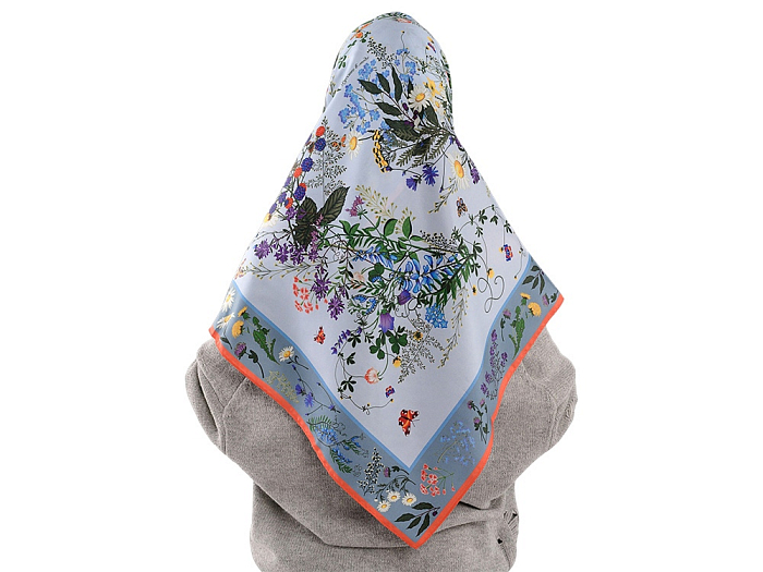 Чудесные незабудки и ромашки, нежные васильки, пышный клевер образуют полукруг венка с вплетенными листьями лавра, чабреца, мяты. Пудровый тон фона создает ощущение простора и воздуха, а контрастная окантовка делает драпировку платка особенно эффектной.