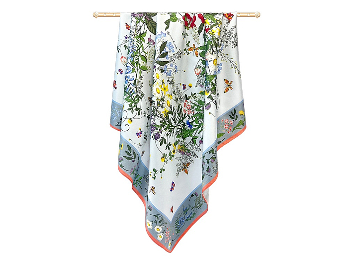 Яркое благоухающее разноцветье русского полевого букета воплощено в шелковом платке, где собраны изображения более 20 цветов и трав.