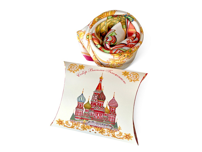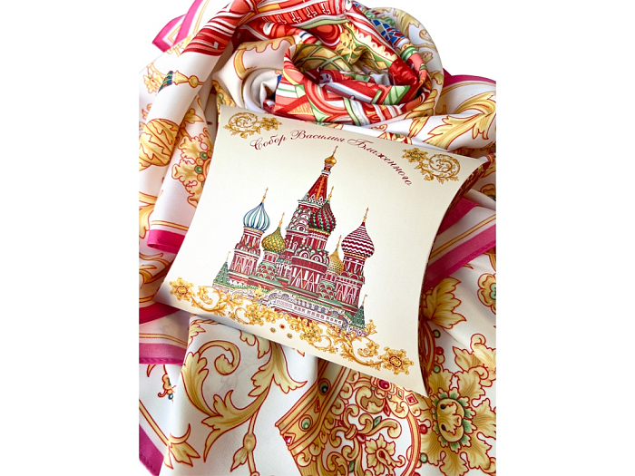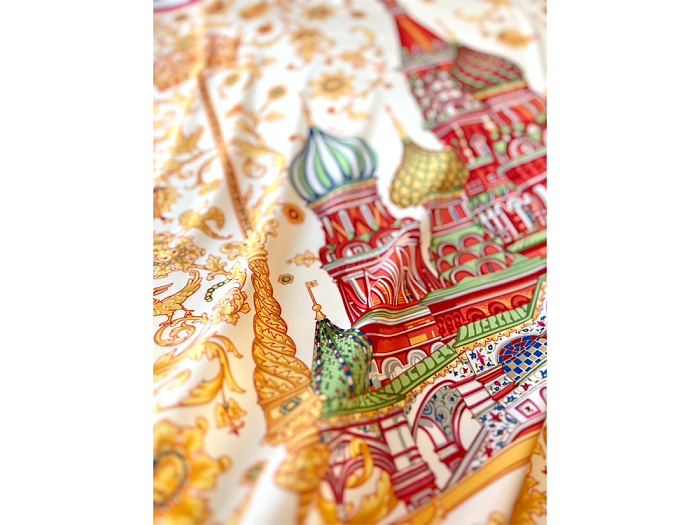 Сказочный вид собора отражен на золотом фоне новинки от бренда «Русские в моде» by Nina Ruchkina. Настоящее восьмое “чудо Света” обрамлено царскими коронами и райскими птицами, свидетельствующими об уникальности и роскоши этой исторической достопримечательности, отстроенной 1 октября 1552 года на праздник Покрова Богородицы.