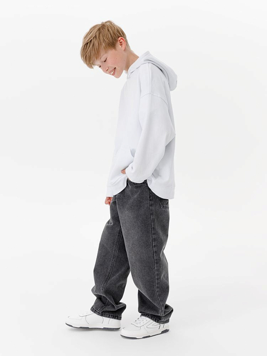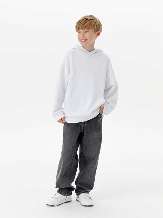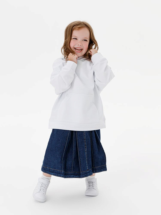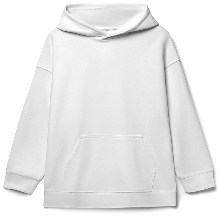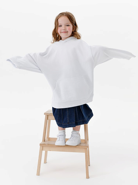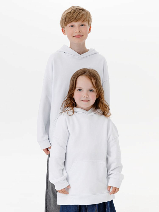 Детское худи оверсайз со спущенным плечом и карманом-кенгуру.