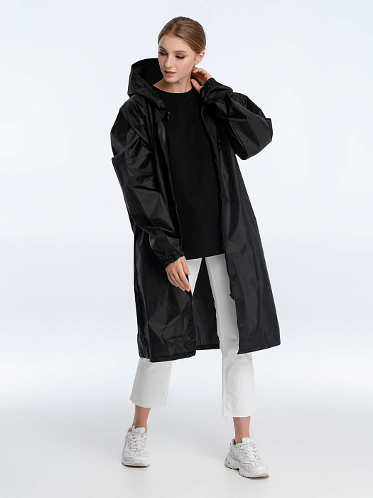 Плащ-дождевик из ткани таффета на молнии с капюшоном. Складывается в мешочек — удобно брать с собой.