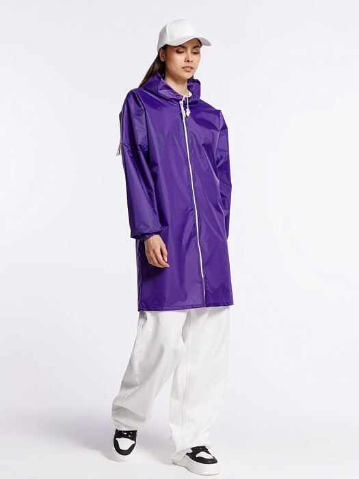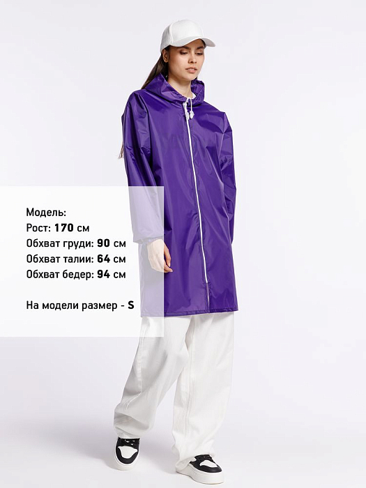 Плащ-дождевик из ткани таффета на молнии с капюшоном. Складывается в мешочек — удобно брать с собой.