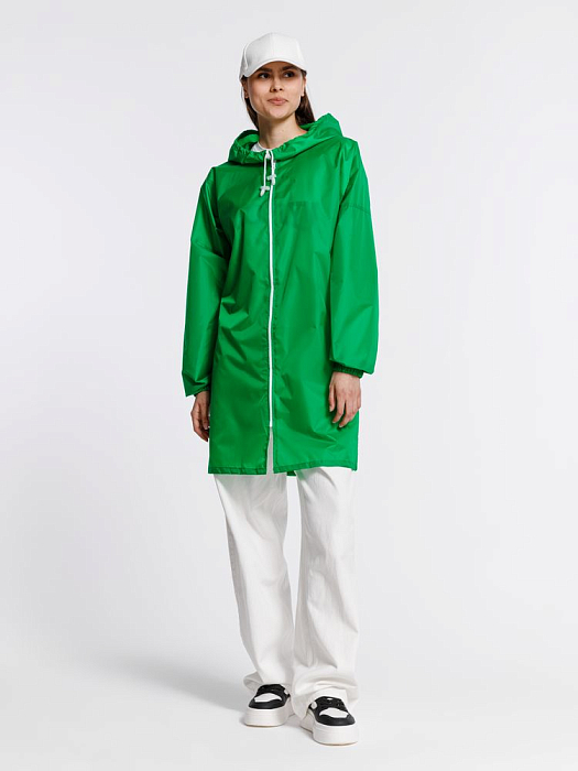 Плащ-дождевик из ткани таффета на молнии с капюшоном. Складывается в мешочек — удобно брать с собой.