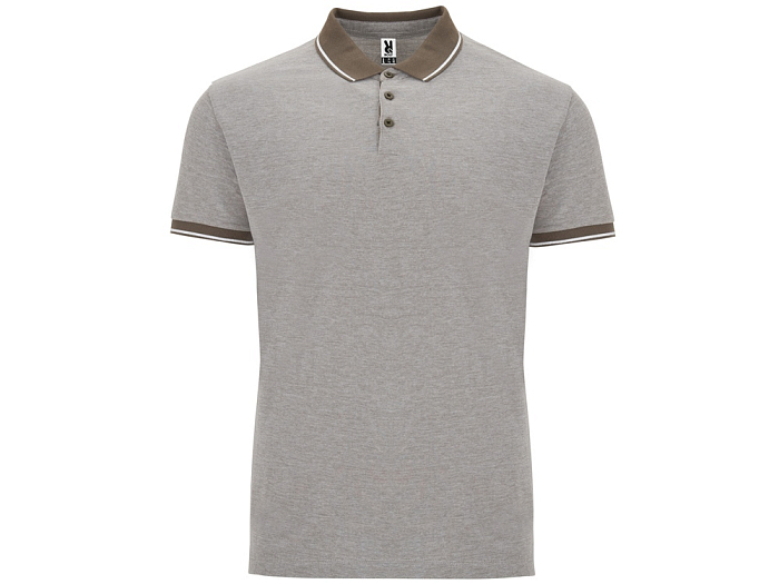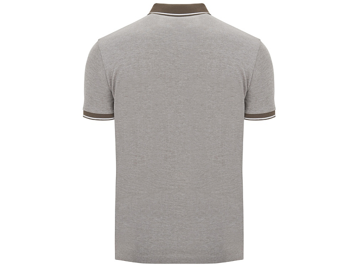 Рубашка поло с коротким рукавом. Манжеты и воротник из однотонного риба 1х1 с контрастными полосками. Планка на 3 пуговицы. Низ с боковыми разрезами, отделанными тесьмой. Спинка немного длиннее полочки. Полотно с меланжевым эффектом.