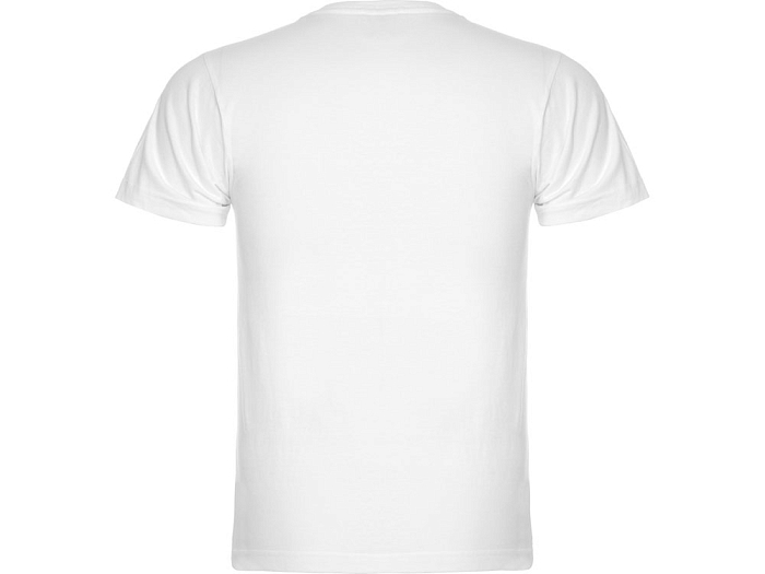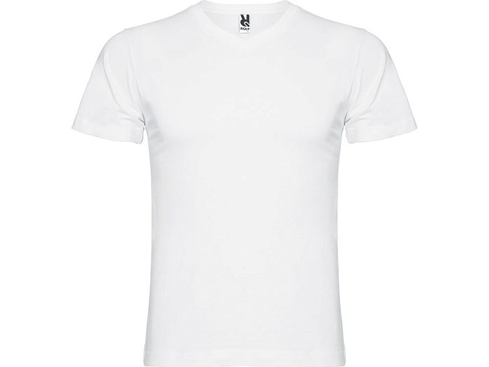 Мужская футболка без боковых швов с коротким рукавом и V-образным вырезом горловины, отделанном рибом 1х1. Горловина и плечевые швы дополнительно укреплены тесьмой.