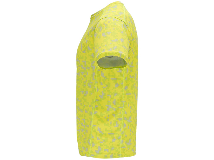 Футболка с принтом и короткими рукавами. Круглая горловина с усиленными закрытыми швами контрастного неоново-желтого цвета. Боковые вставки с внутренней стороны рукавов и на плечах с оверлочными швами в тон.