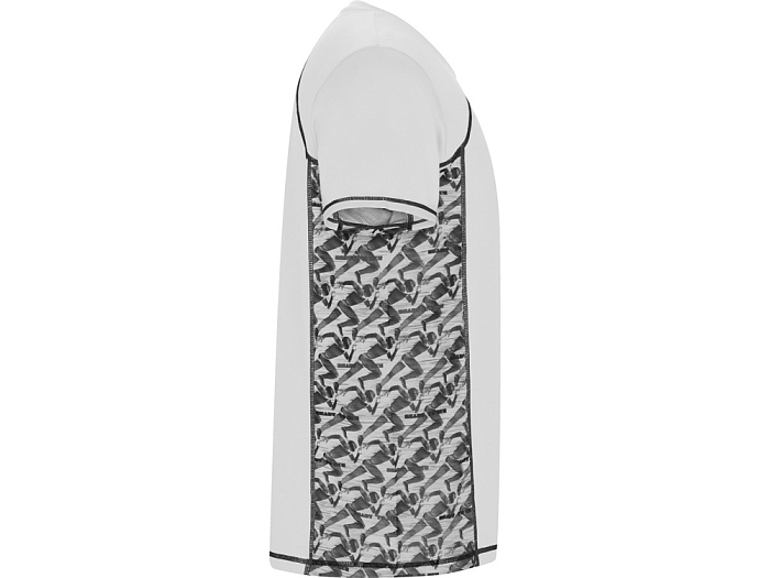 Спортивная футболка с коротким рукавом и принтованными вставками. Контрастные отстрочки плоским швом, светоотражающие элементы на полочке и спинке. Эко лейбл на рукаве.