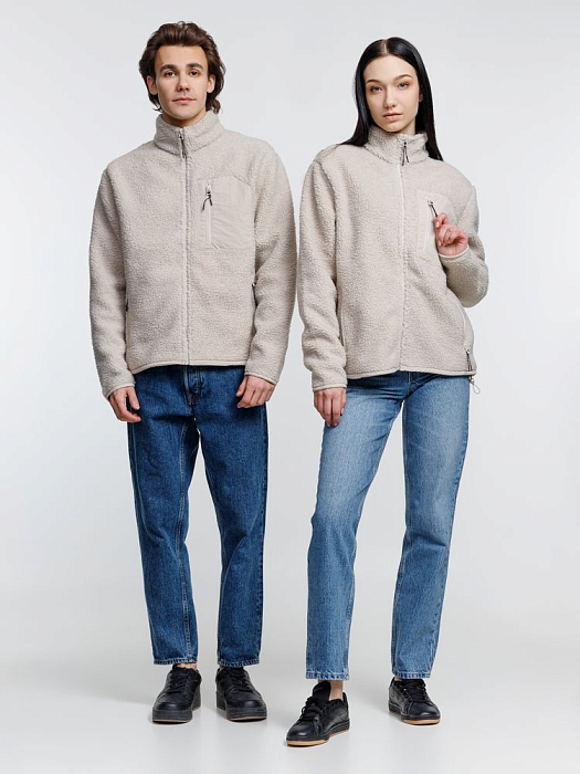 Куртка унисекс из фактурной искусственной шерпы с гладкой отделкой из таслана.