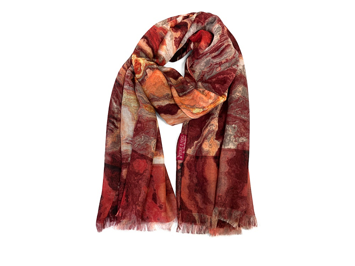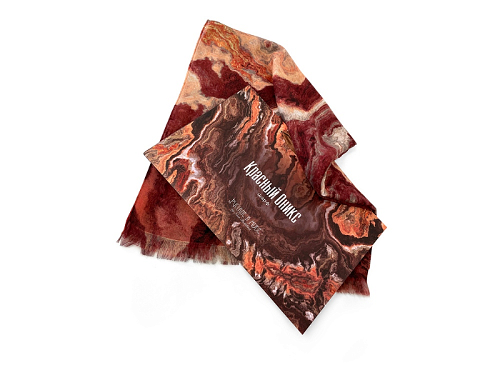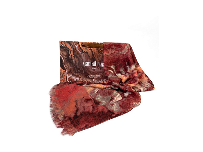 Коллекционный шарф “Красный Оникс”, выполненный дизайнером Ниной Ручкиной, посвящен минералу Карнеолу (Красному Ониксу). С древних времен этот камень считается символом силы, который носили вожди и победители. В наши дни его любят ценители искусства и драгоценностей, интеллектуалы и почитатели оригинальных украшений. Шарф с уникальной текстурой Красного Оникса подойдет сильным и амбициозным личностям, лидерам по своей натуре Его насыщенная цветовая гамма поможет грамотно расставить недостающие акценты в образе, и сделать его гармоничным. Аксессуар хорошо сочетается с гардеробом в разных стилях, даря радость счастливому обладателю и восхищение окружающим.