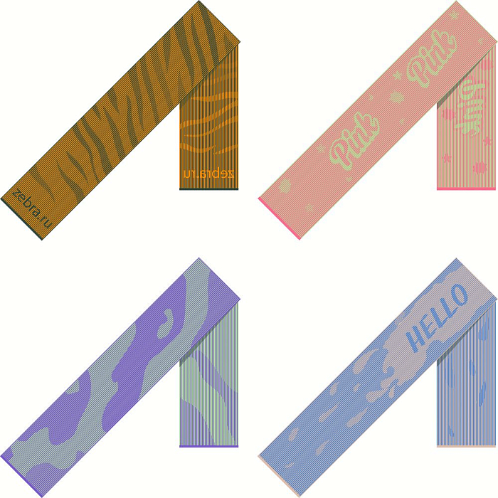 Модель: шарф с жаккардовым узором, рисунчатый эффект получается за счет смены петель. Вязание возможно только в 2 цвета: рисунок читается с обеих сторон шарфа, но на обратной стороне происходит инверсия цвета — текст оказывается в зеркальном отражении. Модель не имеет швов, вяжется единым полотном. Имеет лицевую и изнаночную сторону.