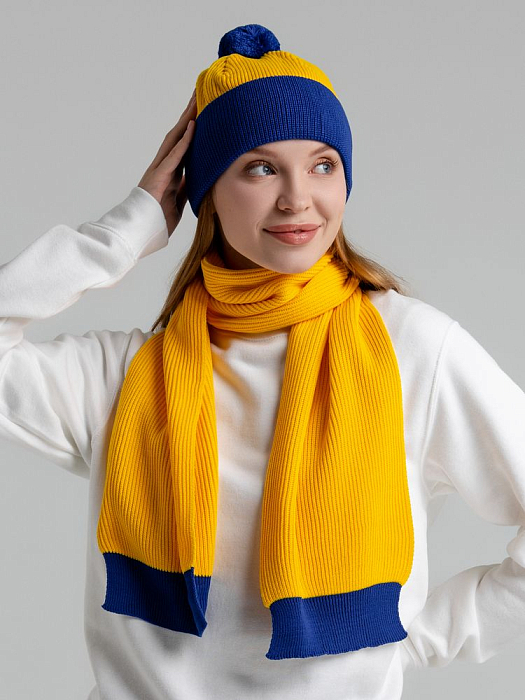 Двуслойная шапка фактурной вязки с контрастным подворотом и помпоном.