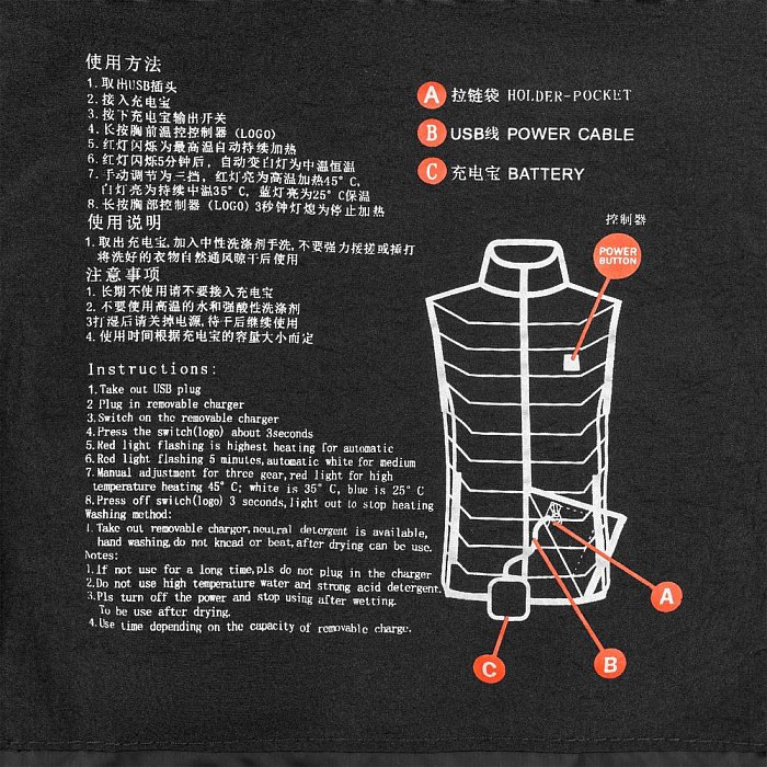 Утепленный жилет со встроенным нагревательным элементом из углеродного волокна в области спины и шеи. Работает от внешнего аккумулятора (в комплект не входит), подарит ощущение тепла и комфорта в любую погоду.