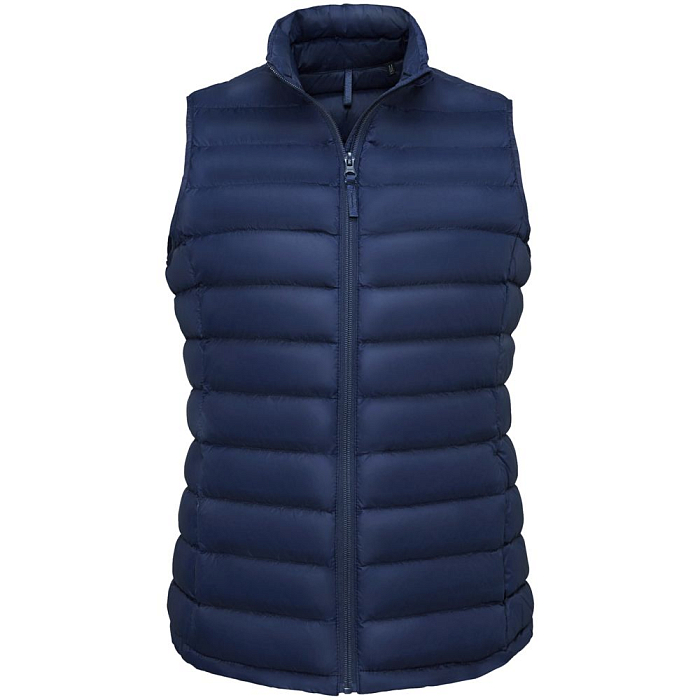 Женский стеганый жилет облегающего кроя на молнии с воротником-стойкой.