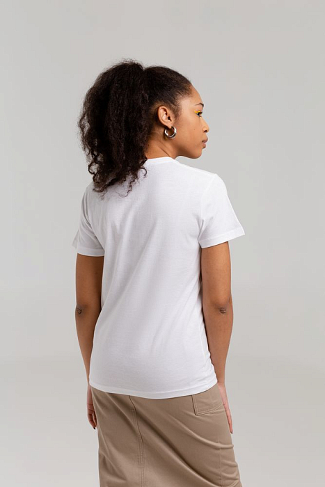 Женская футболка с уплотненными швами на плечах и двойным швом с эластаном. Четырехслойная резинка на воротнике предохраняет его от растяжения.