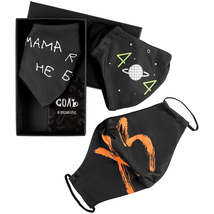 Набор из трех многоразовых масок из дышащей ложной сетки с ярким принтом с гигиенической хлопковой подкладкой и заушниками-резинками.