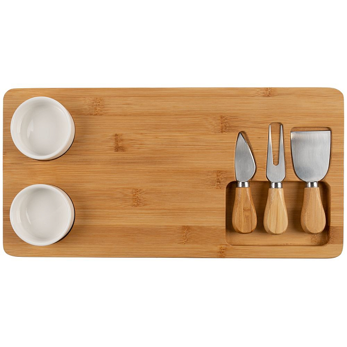В набор входят доска из бамбука, два керамических соусника, вилка, листовидный нож для сыра твердых сортов, нож-лопатка для мягкого сыра.