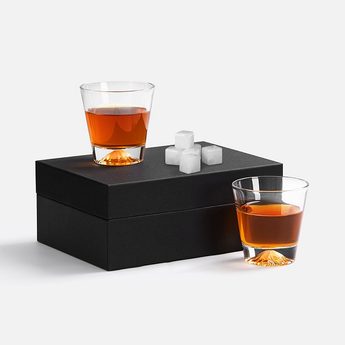 Дно бокалов выполнено таким образом, что кажется, будто в него заключена гора со снежной шапкой, а изготовленные из белого кварца камни для охлаждения напитка выглядят точь-в-точь как кубики льда.