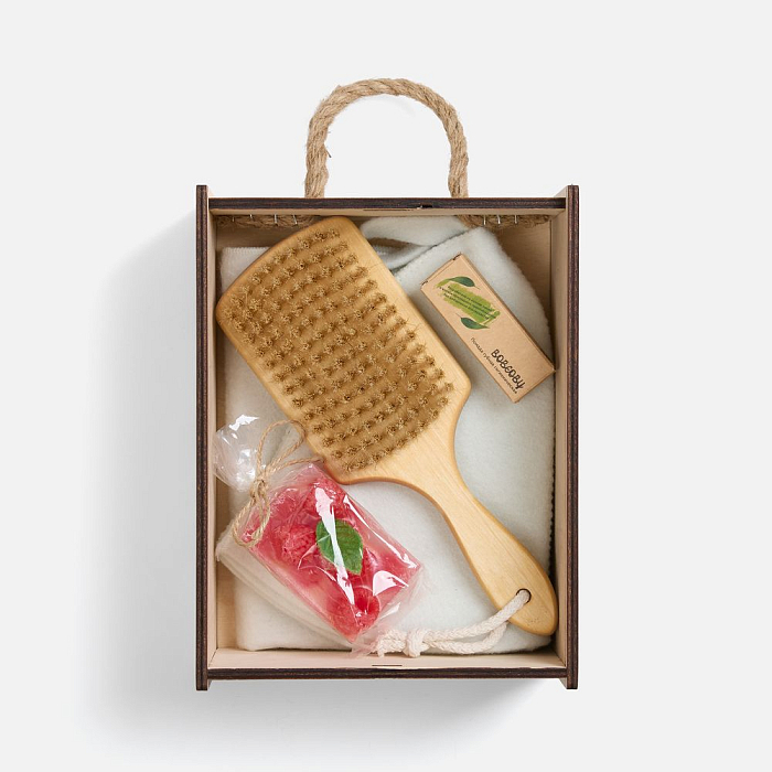 Банный набор Lenna позволит получить максимум удовольствия и пользы от похода в баню. Щетка для сухого массажа поможет подготовить кожу и удалить все ороговевшие клетки, а банная шапочка и коврик сделают процесс парения комфортным и безопасным. Ярко завершить ритуал можно с помощью контрастного душа с очаровательным малиновым мылом. И не забыть защитить губы от ветра гигиенической помадой с нежным ароматом.