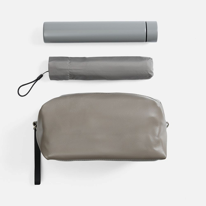• Размеры несессер: 22х12х12 см, в сложении 23х14х4 см; зонт: длина 49 см, диаметр купола 90 см, длина в сложении 22 см; термобутылка: диаметр 4,3 см, высота 23,5 см
