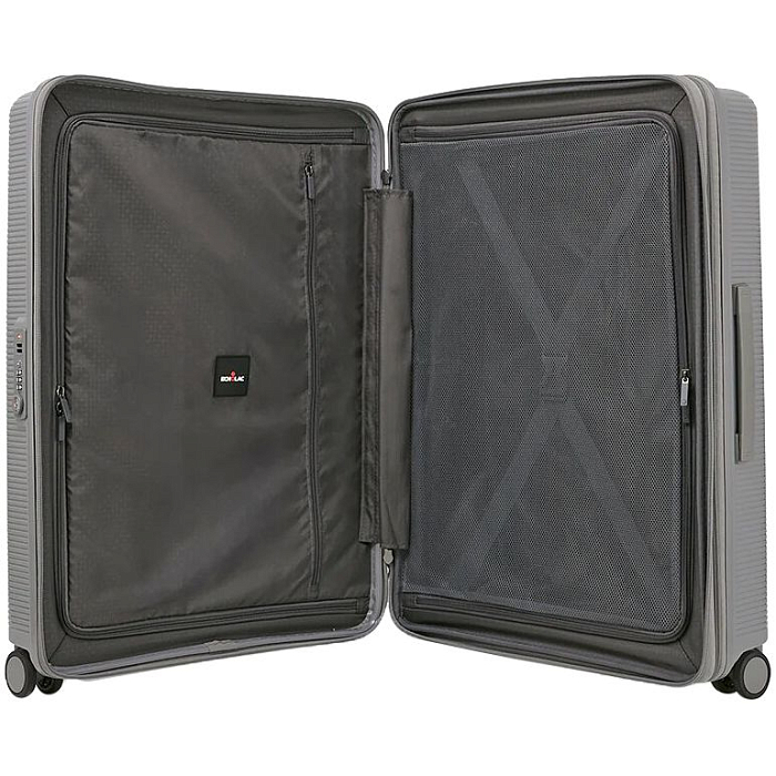 • Чемодан с 2 отделениями: одно из них с фиксирующими ремнями и сетчатым разделителем, второе — с разделителем и карманом-органайзером на молнии