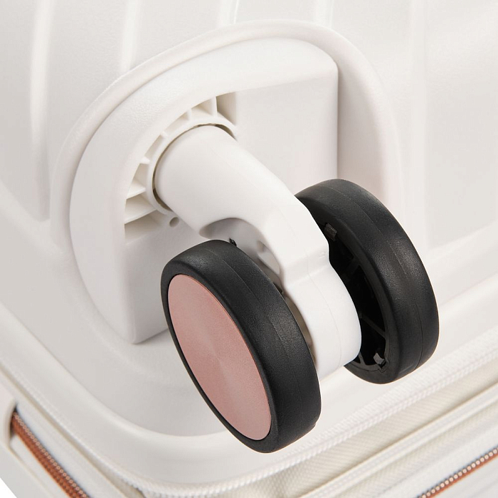 • Блок крепления колеса встроен в корпус чемодана, что обеспечивает лучшую устойчивость к внешнему воздействию