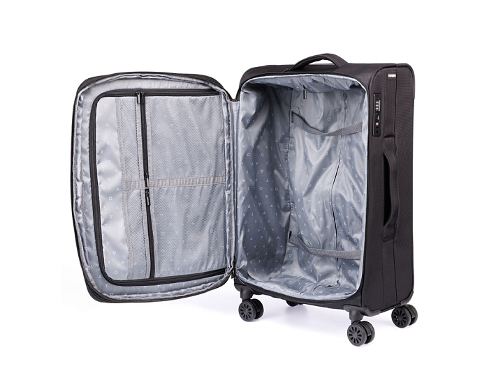 Чемодан полностью раскрывается на 2 отделения, с перегородкой на молнии и ремнями для надежной фиксации вещей на месте.