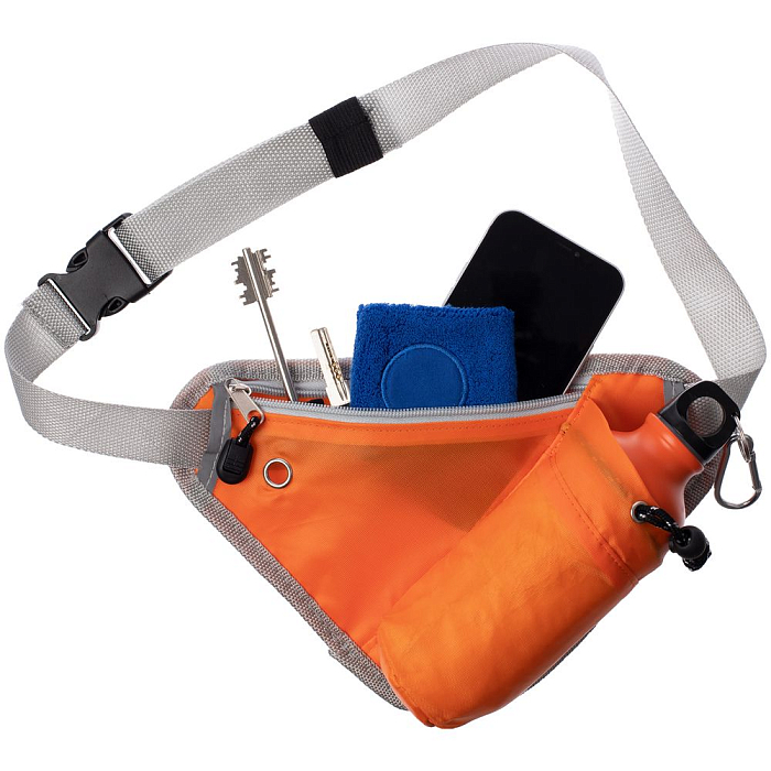 Сумка имеет внешний карман на молнии для хранения телефона и полезных мелочей и отделение со шнуром-фиксатором под бутылку для воды диаметром до 7 см. Ремень выполнен из прочной регулируемой стропы. Светоотражающие детали помогут оставаться заметными во время тренировок в сумерках и темноте.