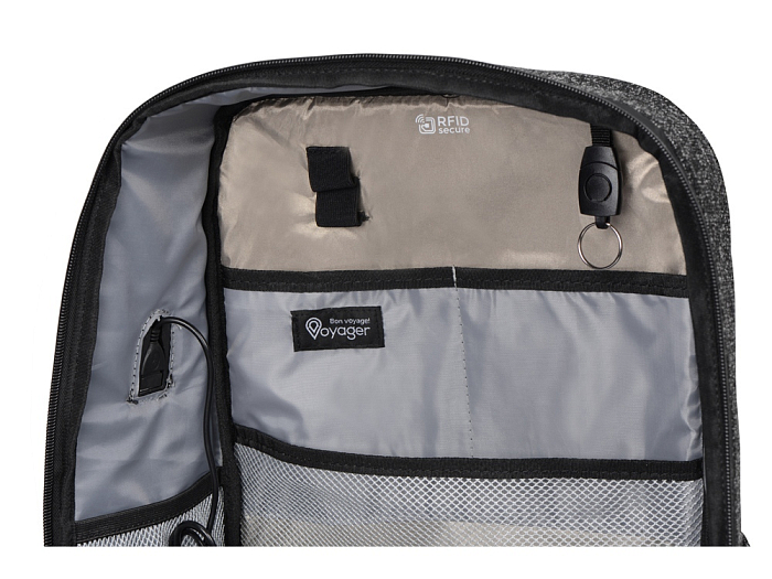 • лицевая сторона рюкзака полностью защищена от несанкционированного считывания данных по протоколу RFID - вы можете класть карточки и электронные устройства в любое отделение органайзера и быть абсолютно уверенными в их защищенности,
