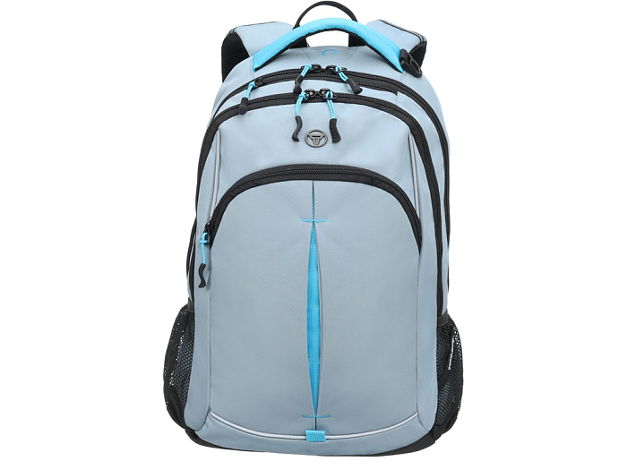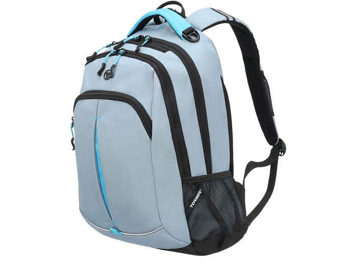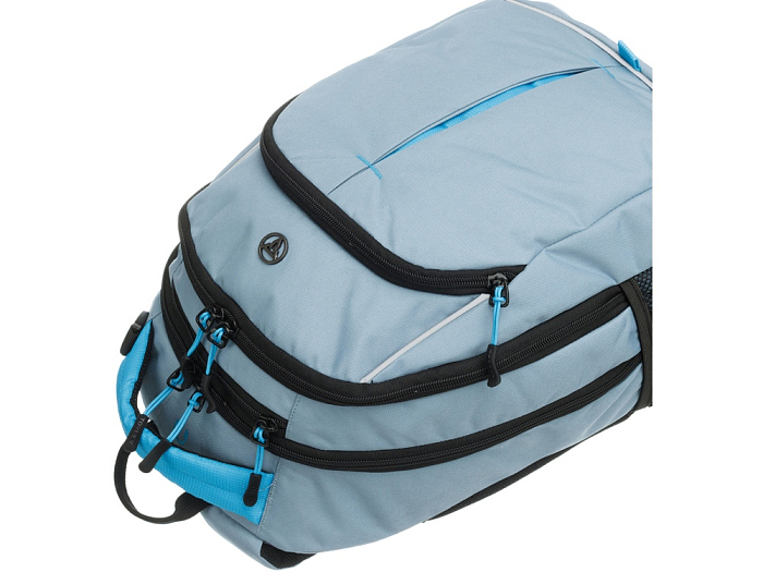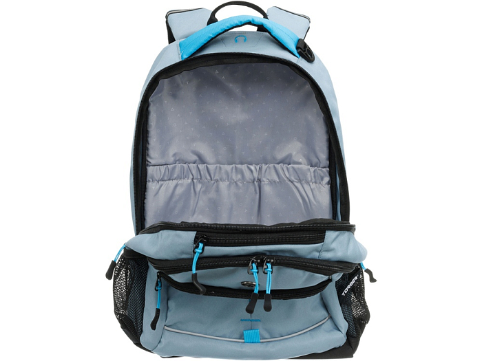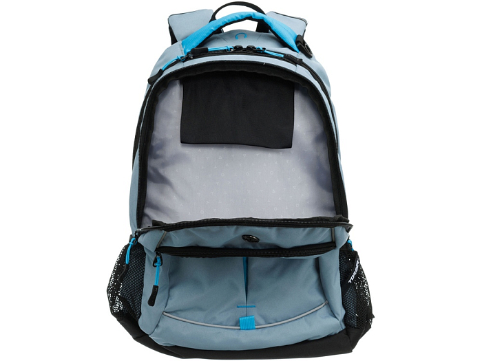 Два боковых кармана из эластичной сетки предназначены для хранения бутылок воды или зонта. Карман-органайзер и кольцо для ключей помогут вам упорядоченно разложить большое количество мелких предметов. Рюкзак имеет эргономичную ручку для более комфортного использования. Оригинальный дизайн и неповторимый стиль модели подчёркивают серый и голубой цвета.
