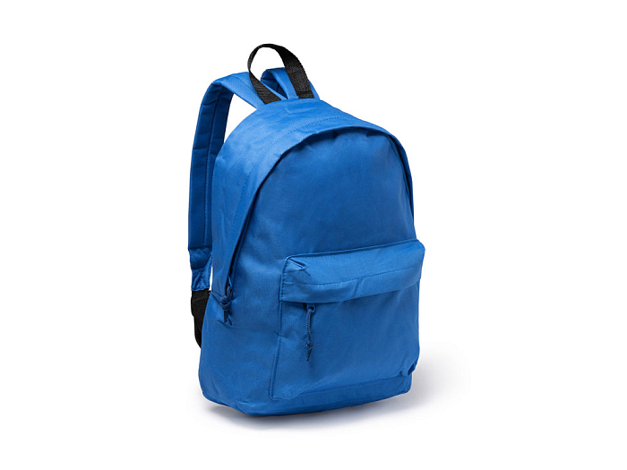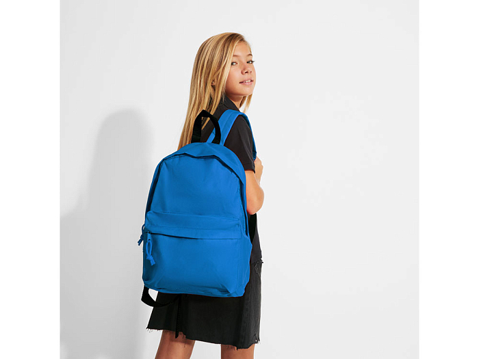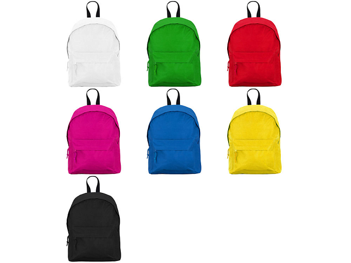 Базовый рюкзак из прочной ткани. Двойной плечевой ремень и контрастная ручка. Два кармана: основной и один спереди с молниями, клапанами и бегунками в тон