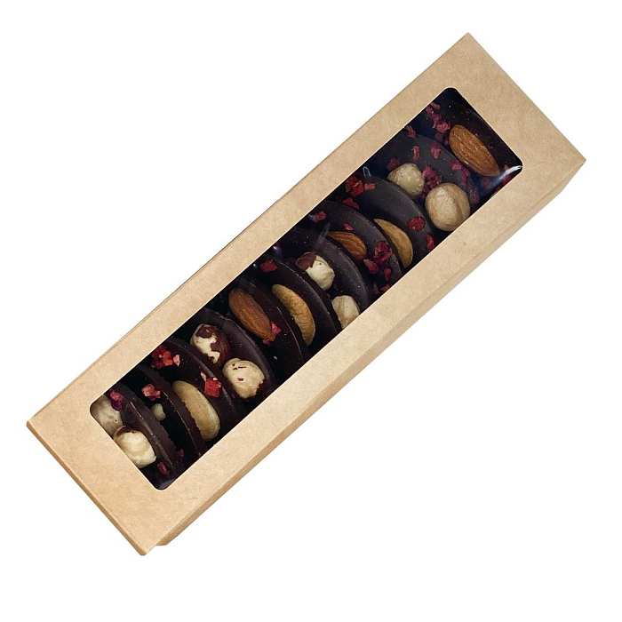 В наборе 12 медиантов из темного шоколада с посыпкой из сублимированных ягод и орехов.