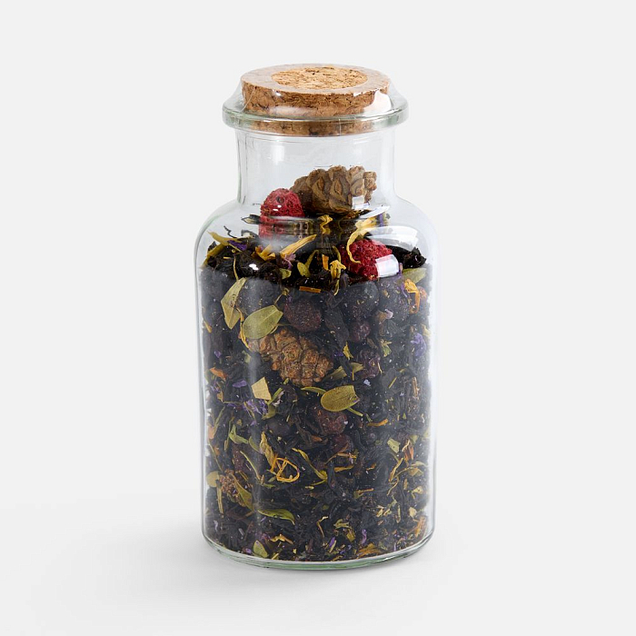 За ягодный вкус отвечают сублимированные малина и смородина, усиленные ароматом черной смородины. Лепестки календулы и мальвы придают настою солнечный оттенок и цветочное послевкусие. Идеальный баланс между тонизирующим эффектом и ягодной сладостью.Состав: чай черный, плоды боярышника, клюква, листья брусники, плоды можжевельника, мята, сосновые шишки, розмарин, листья саган-дайля, лепестки календулы, малина, сублимированная, красная смородина сублимированная, цветки мальвы, ароматизатор «Черная смородина».