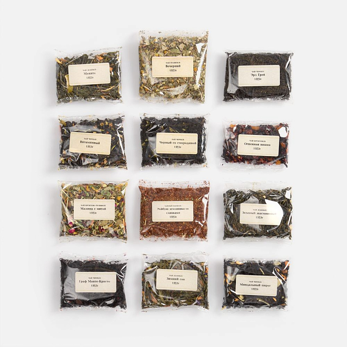 - Вечерний травяной. Состав: мелисса, лист смородины, ромашка, мята, шалфей, цветки василька, мальва, лаванда, ароматизатор «Смородина».