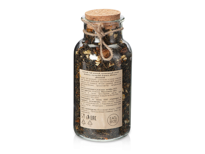 Состав: чай зелёный с ананасом и соком ананаса (чай зелёный байховый крупнолистовой, кусочки ананаса, сок ананаса), яблоко сушеное, облепиха сублимированная, ароматизатор натуральный "Яблоко".