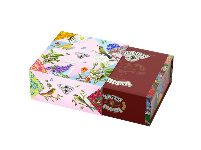 Купажи чая составлены так, чтобы сочетать вкус и аромат отборных сортов китайского и индийского чай с красотой разноцветных лепестков мальвы, лилии, жасмина и акации. В набор также входят монпансье со вкусом чёрной смородины и цукаты из кумквата. Внутри шкатулки находится мини-открытка, которую покупатель может подписать.