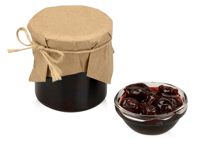 Банка варенья обернута крафт-бумагой, на которую возможно сделать нанесение корпоративного логотипа.