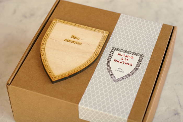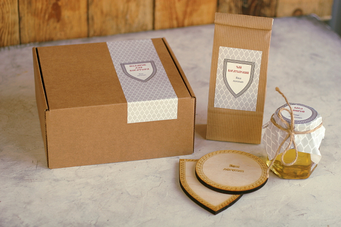 • Брендирование На всех печатных элементах набора: наклейка на коробку, обечайка на мед, наклейка на чай.