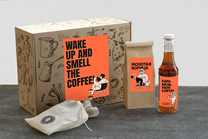 • Крафт коробка с дизайнерским принтом на кофейную тему и наклейкой для брендирования