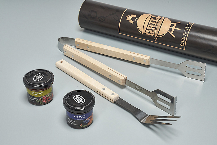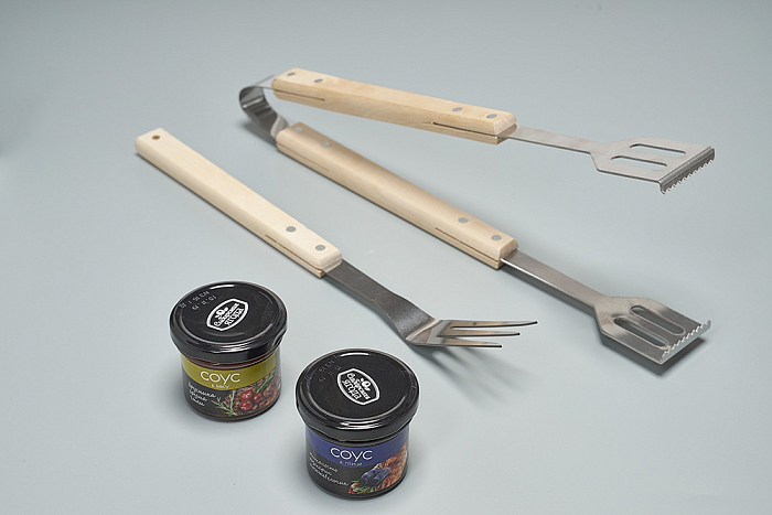 В наборе есть необходимые инструменты для барбекю, а также вкусные соусы к мясу.