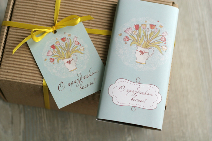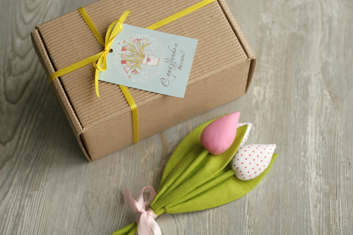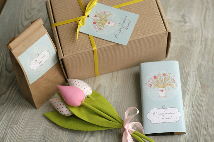 Не обязательно дарить живые тюльпаны, когда можно подарить вот такой корпоративный подарок - комплимент. В нем есть вкусная шоколадка и чай и нежные весенние тканевые тюльпаны, которые долго будут радовать.