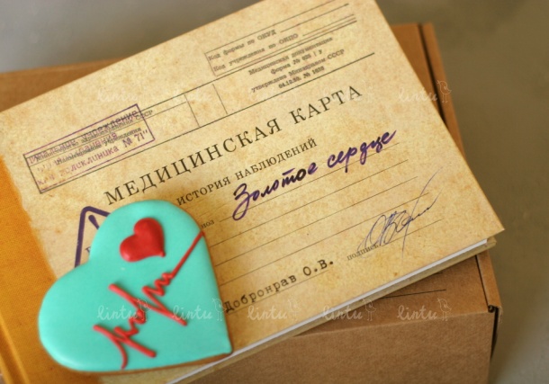 - набор «Золотое сердце» – в него входит записная книжка в виде медицинской карты и 2 пряника (в форме рубашки врача и сердца);