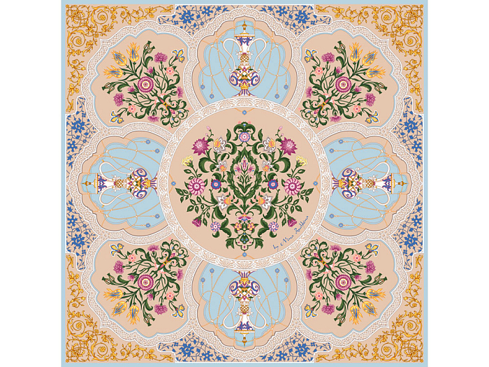 Принт аксессуара образуют знаменитые орнаменты востока — гирих (бесконечный “узел”) и ислими (“путь в божественный сад”). Непрерывные витиеватые линии в сочетании с узорами из гибких стеблей с зеленой листвой и пестрыми соцветиями завораживают, погружают в состояние медитации, постижения тайны мироздания через призму счастья и красоты.