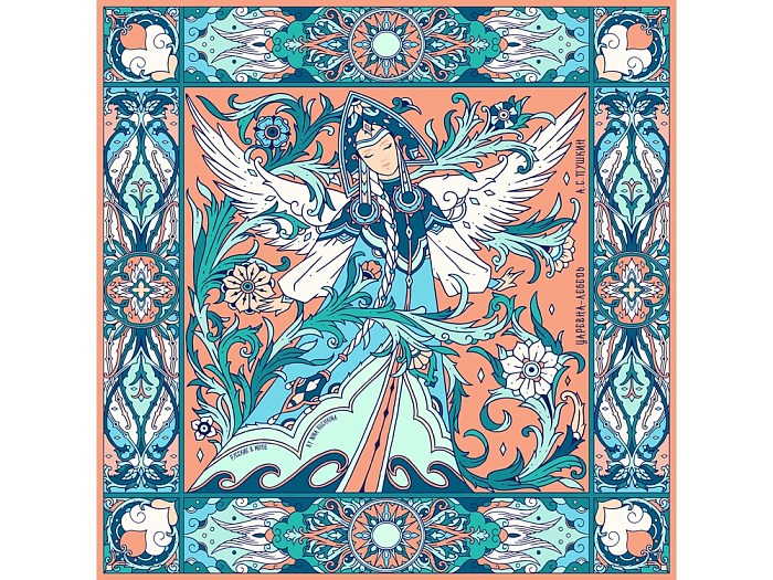 Дизайнерский платок “Царевна Лебедь” от Нины Ручкиной стал воплощением сказочного персонажа, прославленного великим и талантливым романтиком и поэтом — А. С. Пушкиным. Именно он впервые подарил нам образцы художественной русской эстетики, исходящей из самой глубины русской души.